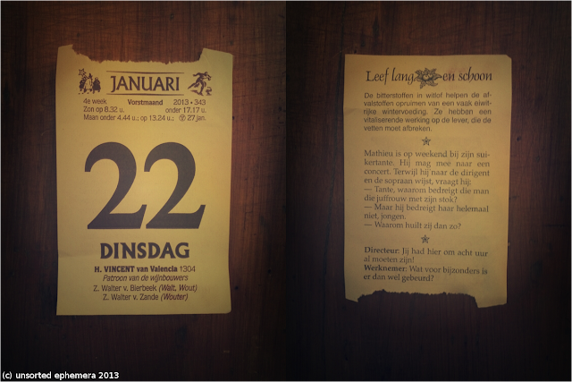 De Druivelaar is part-calendar, part-almanac, part-joke book--the month and day are printed in front with additional information about which week in the year it is, the number of days before the year-end, sunrise/sunset/moonrise/moonset times, and the name of the saints associated to that date. When you tear the date off the block, you can see the jokes, announcements for local festivals, and other random bits of trivia, proverbs (and sometimes, woodcut prints) on the reverse side of the sheet. These "random bits" caught my eye, and so when I went to the local bookstore/stationer right after New Year's, I bought one.